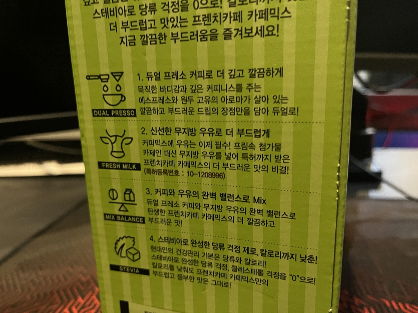 듀얼프레소커피 , 무지방 우유, 무설탕에 스테비아로 건강한 단맛을 낸 커피믹스네요.
